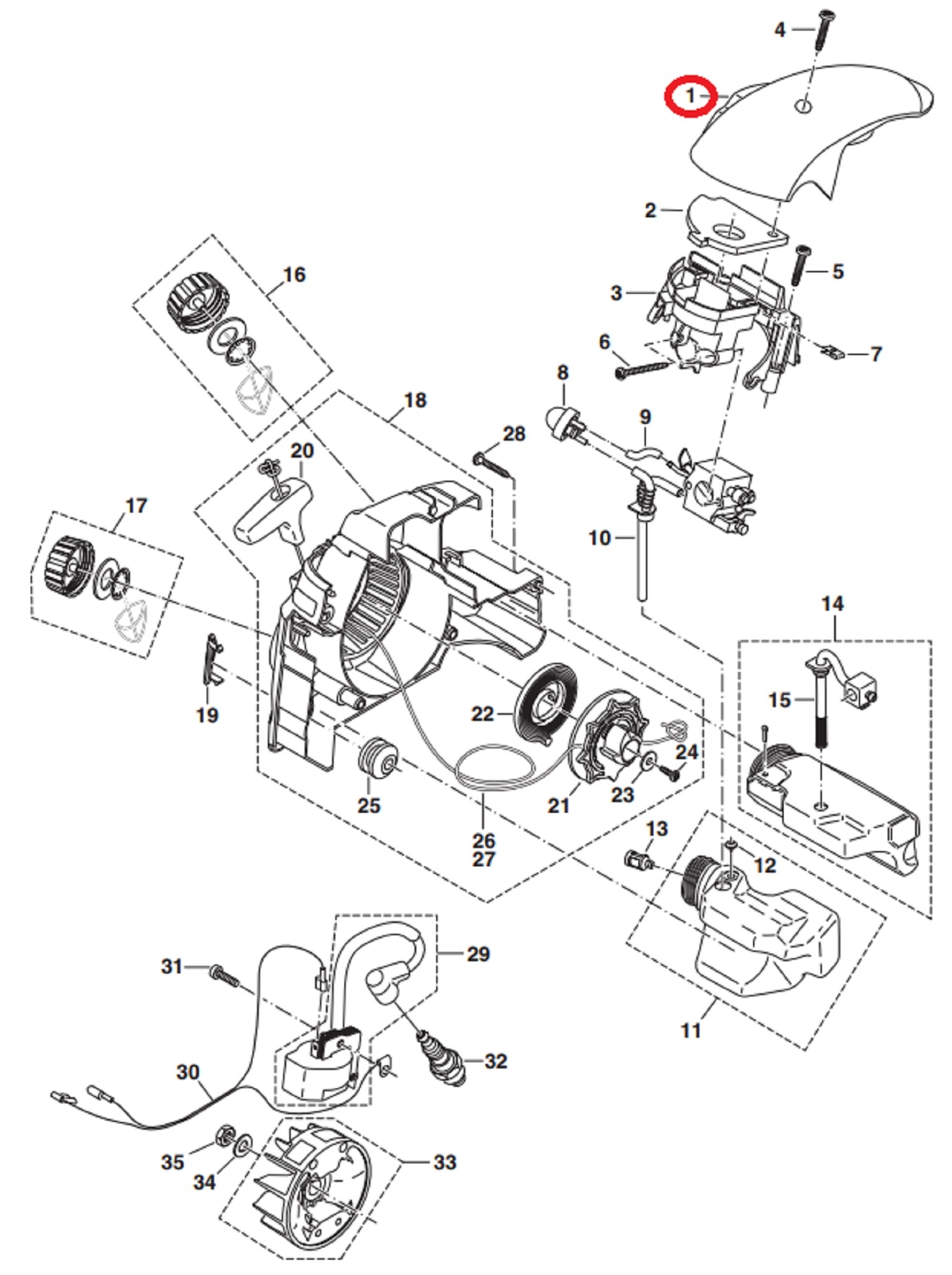 TerugHomeAfdekkap Zwart voor MAKITA, DOLMAR PS34, PS36, PS41, PS45 op Kettingzagen, Motorzagen PS-34, PS-36, PS-41, PS-45 Beschermkap