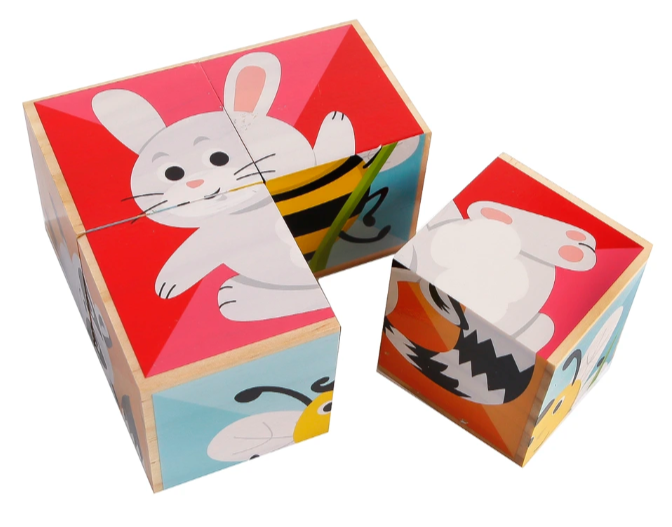 Duurzame FSC-houten blokpuzzel met vrolijke dierenprints. Stevig, veilig en ideaal voor motoriek, spelend leren en fantasie. Compact formaat 10×10×5 cm en direct inzetbaar.