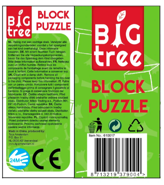 Combineer deze blokpuzzel met andere Big Tree houten speelelementen voor een complete leerzame speelhoek.