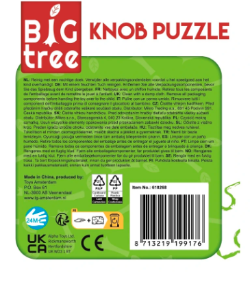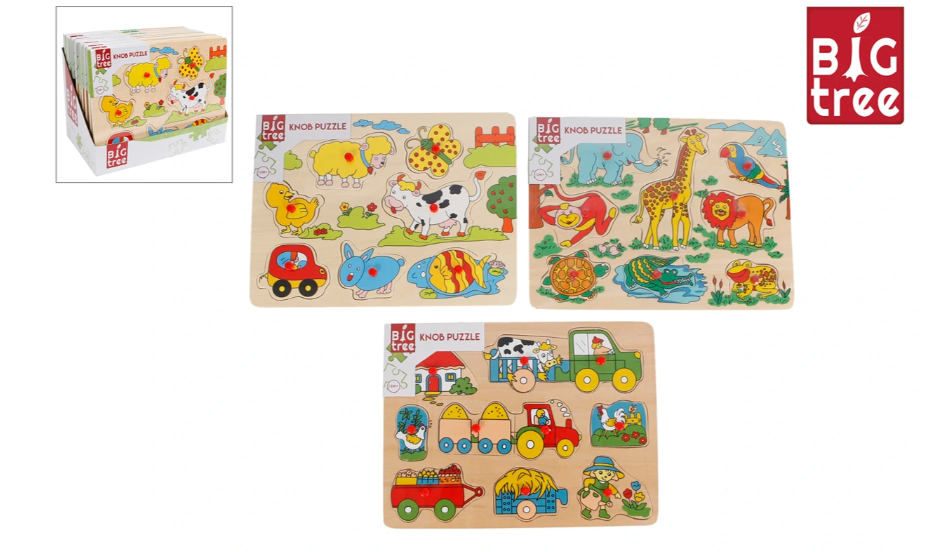 De Big Tree houten knopjespuzzels zijn een vrolijk en leerzaam onderdeel voor jonge kinderen. De stevige houten vormpjes met knopjes maken het makkelijk om stukjes vast te pakken, terug te plaatsen en spelenderwijs nieuwe dieren te ontdekken. Perfect voor thuis, opvang of speelhoek.