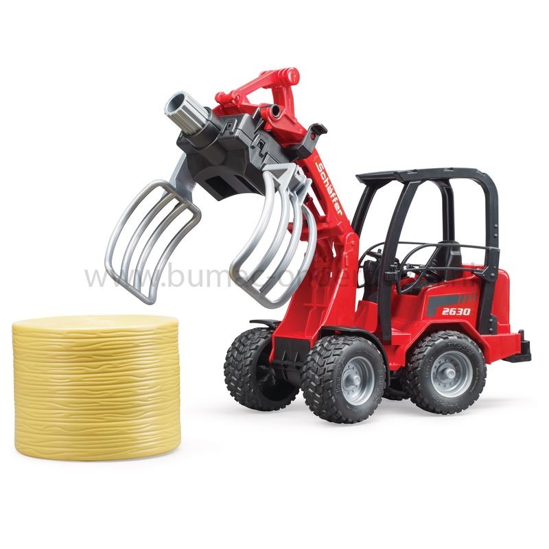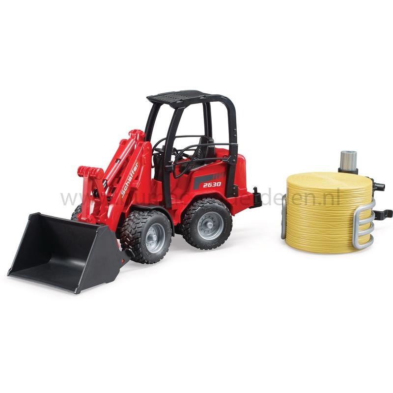 Bruder Schäffer wiellader 2630 speelgoed schaal 1:16 met knikbesturing, laadarm, rolbeugel, balengrijper en ronde balen, robuuste bouwmachine voor kinderen vanaf 3 jaar, onderdeel