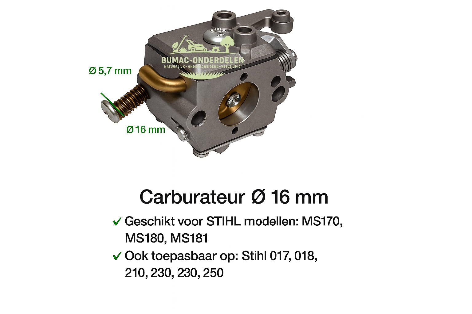 Premium carburateur Ø16 mm, geschikt voor Stihl MS170, MS180, MS181 en ook toepasbaar op Stihl 017, 018, 210, 230, 250. Hoogwaardige kwaliteit met perfecte pasvorm en eenvoudige montage.