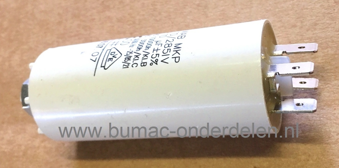 Condensator 10 µFvoor Elektrische Grasmaaier, Grasmachine, Hakselaar, Hogedrukreiniger, Waterpomp Bosch, Black en Decker, Wolf, Greenway, MTD, Husqvarna, Flymo, Gardena, Brill, Jonsered, Viking, Sabo, Partner, Mcculloch.