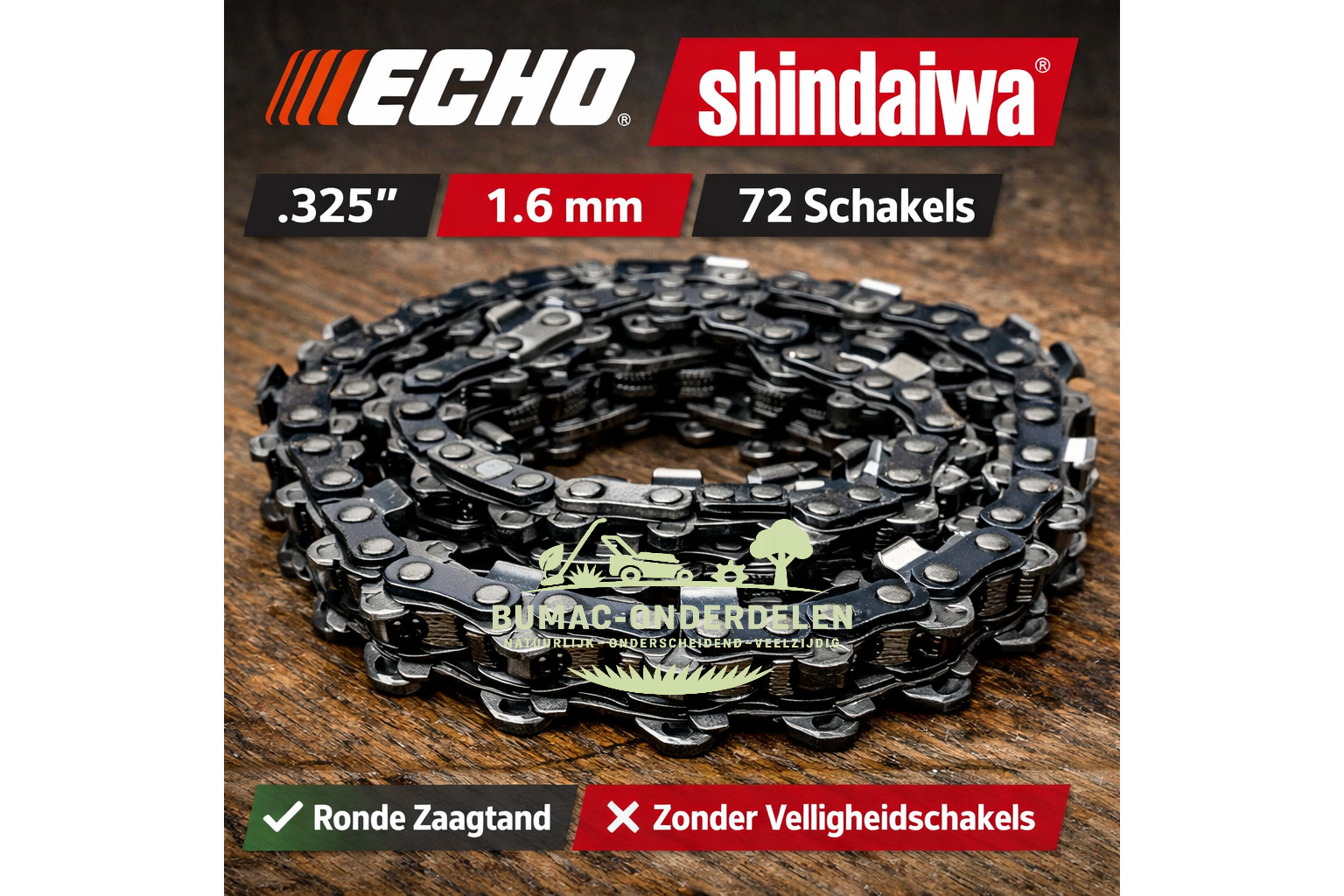 Deze zaagketting is een onderdeel voor Echo en Shindaiwa motorzagen / kettingzagen die werken met .325 steek, 1,6 mm groefbreedte en 72 aandrijfschakels. De ketting is uitgevoerd met een ronde zaagtand en is bedoeld voor gecontroleerd en gelijkmatig zaagwerk in hout.