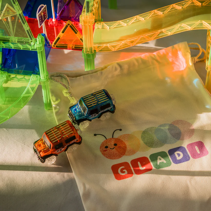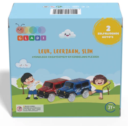 De Gladi Tiles uitbreidingsset met 2 racebaan auto’s brengt snelheid en actie naar elk Gladi-bouwwerk. Deze zelfrijdende voertuigen zijn speciaal ontwikkeld voor gebruik met Gladi Tiles racebanen en magnetische constructies. Dankzij het slimme ontwerp rijden ze soepel en krachtig vooruit, waardoor kinderen hun eigen circuits, hellingen, tunnels en racebanen kunnen bouwen.