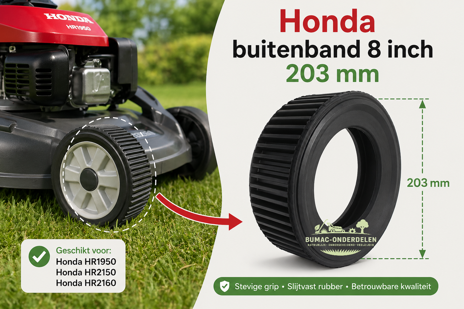 Let op: binnen de Honda HR, HRA en HRB serie komen ook buitenbanden rond 191 mm en 220 mm voor. Deze zijn niet uitwisselbaar met de 203 mm uitvoering. Controleer daarom altijd de buitendiameter van de huidige band voordat je vervangt.