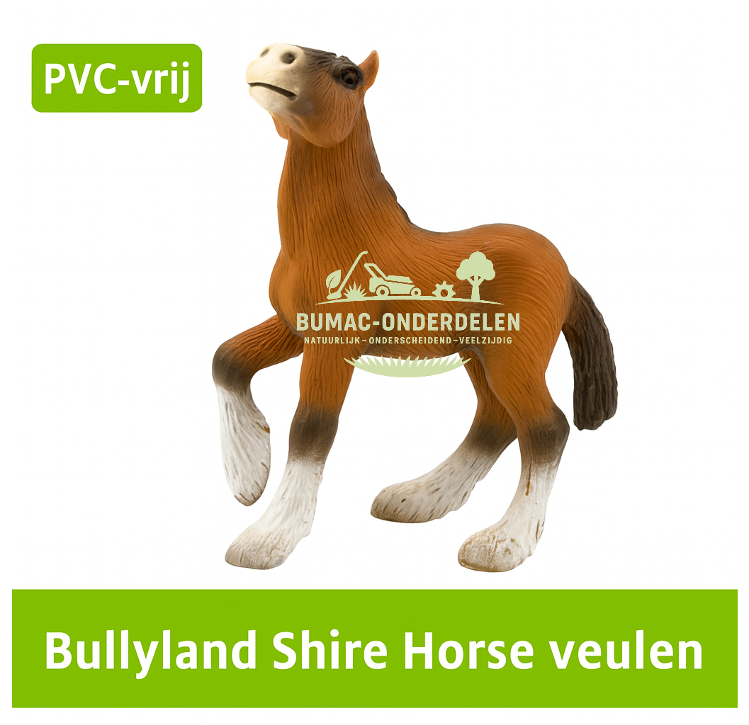 Het Bullyland Shire Horse veulen is een natuurgetrouw vormgegeven speelgoedpaard van het gerenommeerde merk Bullyland. Dit jonge Shire-paard – het grootste paardenras ter wereld – is zorgvuldig met de hand beschilderd. De realistische details, witte aftekeningen en expressieve houding brengen het dier tot leven en maken het een unieke aanvulling voor boerderij- en manege-speelwerelden.
