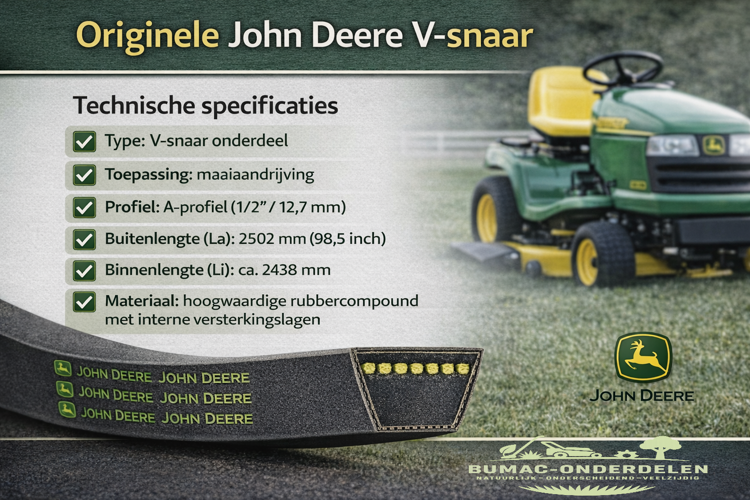 John Deere V-snaar maaiaandrijving 42 inch maaidek onderdeel met originele fabriekskwaliteit voor zitmaaiers met een 42 inch (107 cm) maaidek. Deze originele snaar is exact afgestemd op de constructie van het maaidek en zorgt voor een directe en stabiele aandrijving.