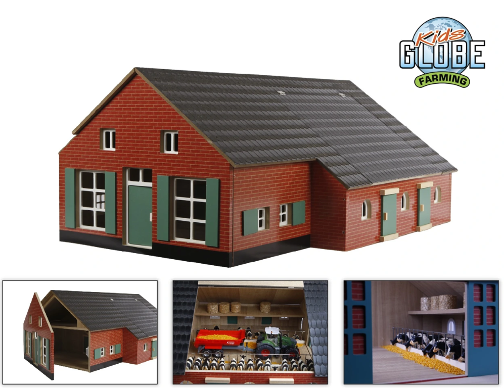 Grote houten Kids Globe boerderij met stal in schaal 1:32. Realistische uitvoering met werkende deuren en openklapbaar dak. Ruimte voor tractoren, dieren en accessoires. Perfect voor urenlang speelplezier.