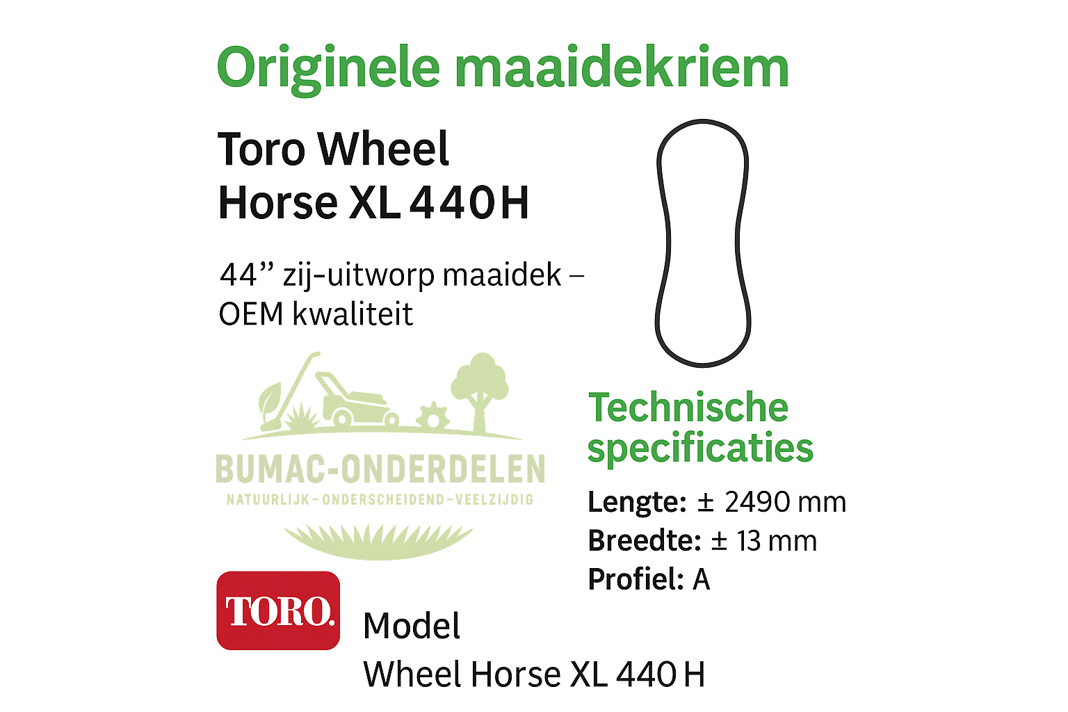 Originele maaidekriem voor Toro Wheel Horse XL 440H, geschikt voor het 44” zij-uitworp maaidek. OEM-kwaliteit met gegarandeerde pasvorm en lange levensduur.