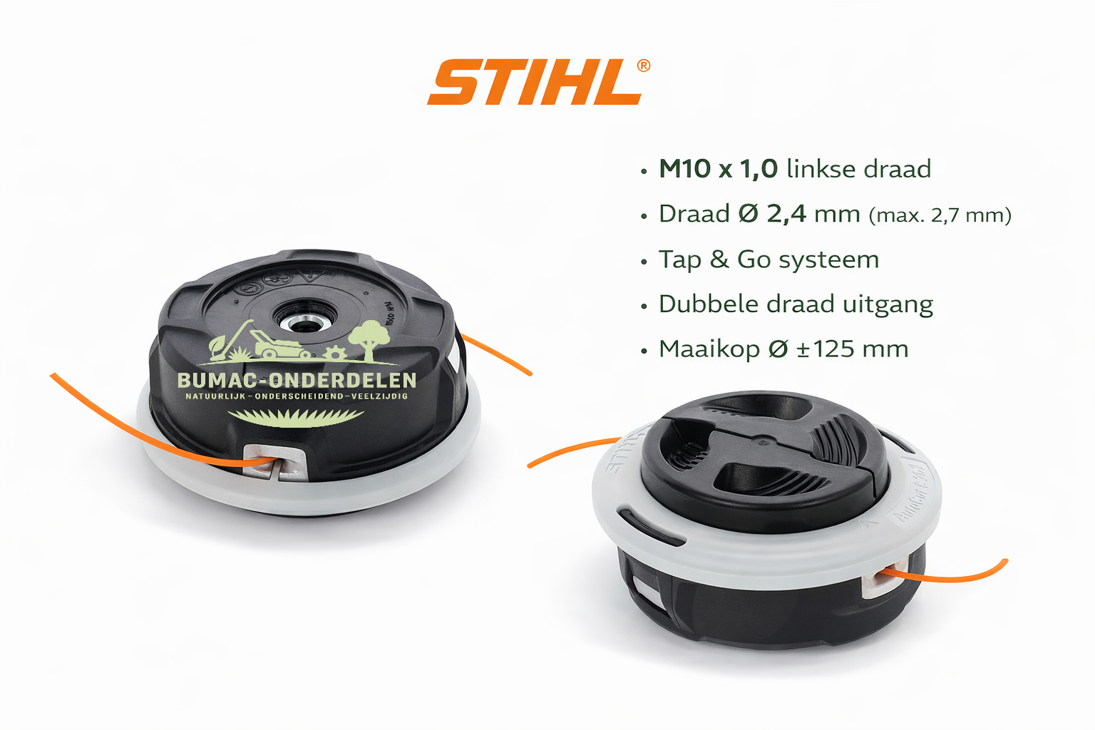 Bij montage van een draadkop op Stihl FS55, FS56, FS70 of FS80 wordt vaak vergeten dat het om linkse draad gaat. Draai de kop altijd tegen de normale richting in vast en controleer na montage of deze goed geborgd zit.