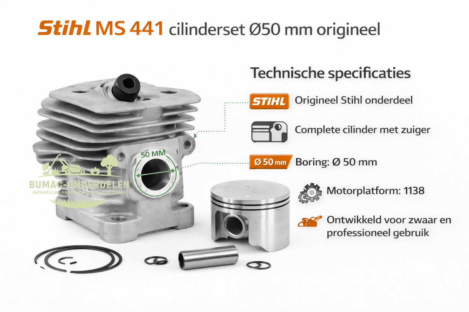 Origineel Stihl cilinder met zuiger Ø50 mm onderdeel voor MS 441 en MS 441 C kettingzaag of motorzaag. Complete cilinderset voor motorrevisie, reparatie of herstelling binnen het 1138-platform.