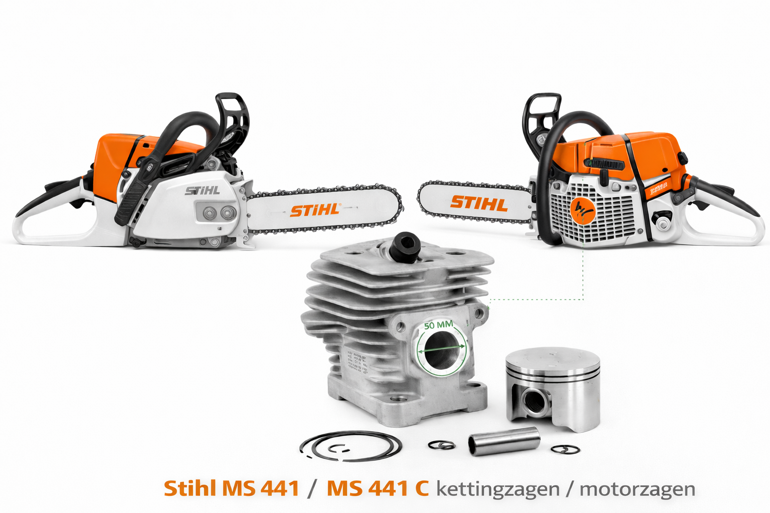 Stihl MS 441 cilinder met zuiger Ø50 mm is een origineel onderdeel voor revisie van de Stihl MS 441 en MS 441 C kettingzaag of motorzaag. Deze complete cilinderset – ook vaak gezocht als cilinder met piston of piston kit – vormt het centrale onderdeel van het motorblok en bepaalt compressie, vermogen en bedrijfszekerheid.