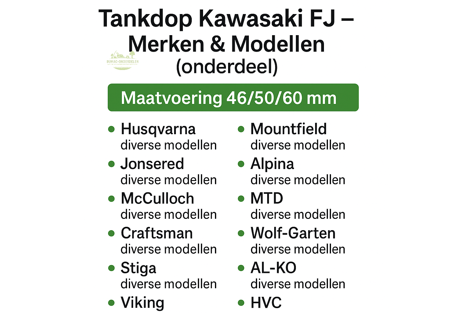 ✅ Ook toepasbaar op o.a.: Husqvarna, Jonsered, McCulloch, Craftsman, Stiga, Castelgarden, Mountfield, Alpina, MTD, WOLF-Garten, Cub Cadet, AL-KO, HVC (controleer maatvoering 46/50/60 mm)