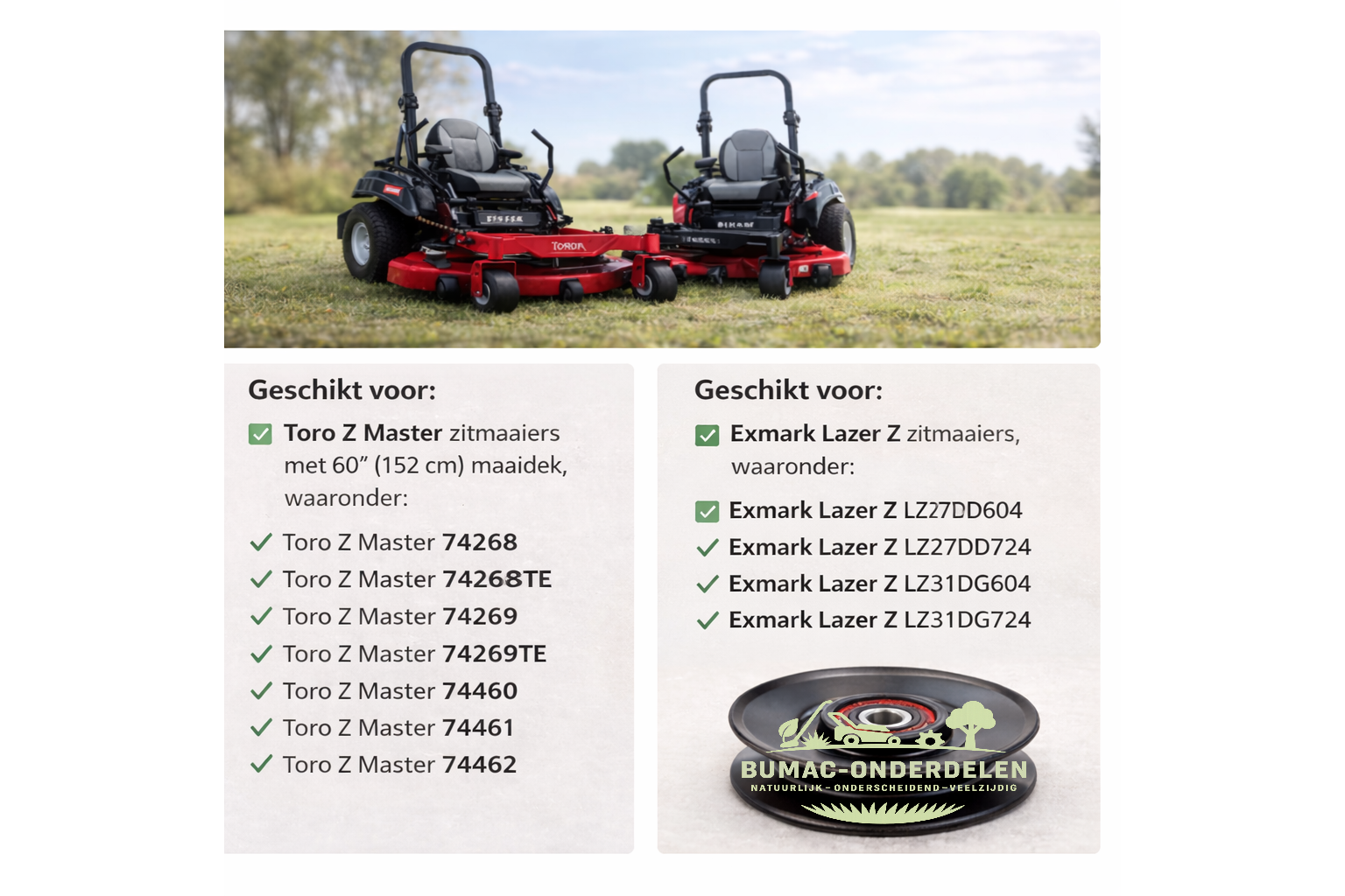 Deze modellen zijn geleverd met verschillende motoruitvoeringen en bouwjaren, waarbij deze spanrol wordt toegepast in de maaidekaandrijving van het 60 inch maaidek.