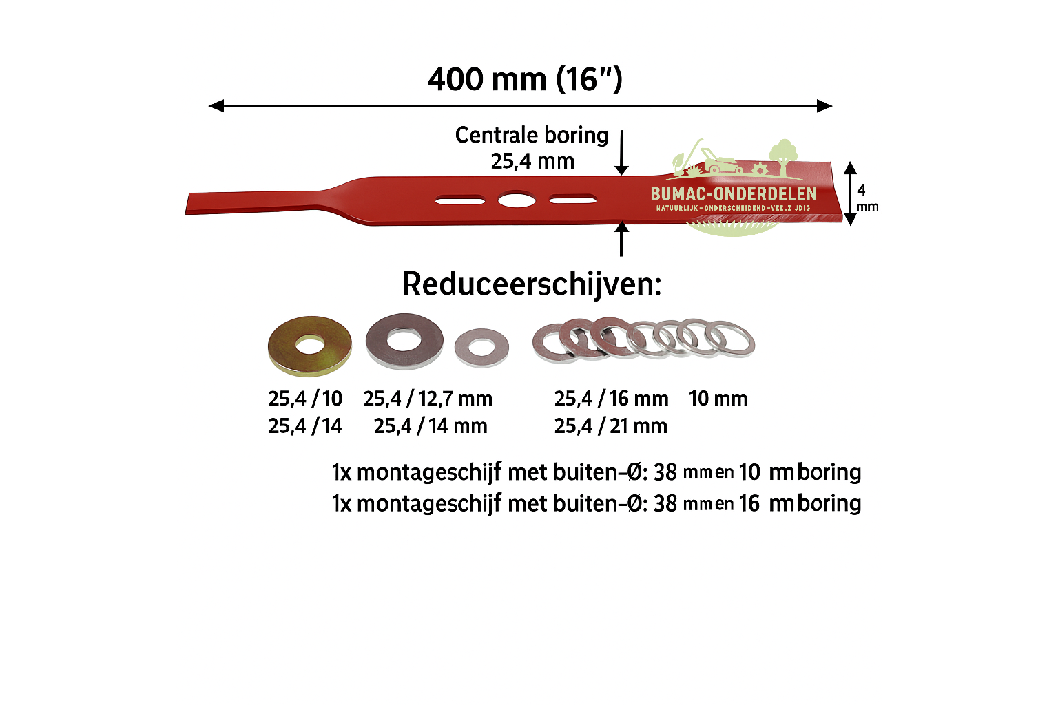 Universeel Maaimes 16" (400 mm) – geschikt voor Zitmaaiers, Frontmaaiers, Tuintrekkers en Grasmaaiers, inclusief verloopringen en montageschijven, onderdeel