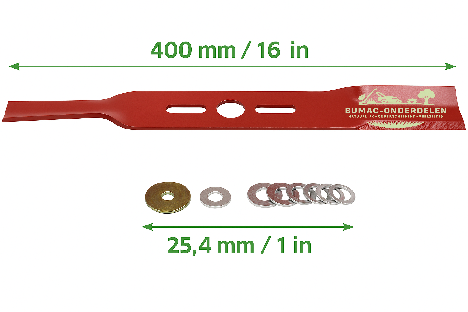 Het Universeel maaimes 16" (400 mm) biedt een flexibele oplossing voor wie op zoek is naar een betrouwbaar vervangmes. Dankzij de slimme opname, verloopringen en montageschijven is dit mes breed inzetbaar voor diverse merken en modellen.