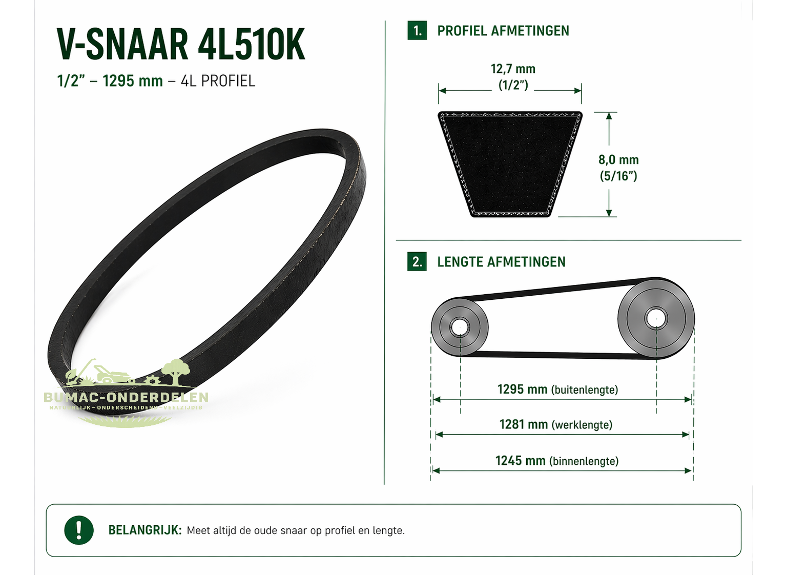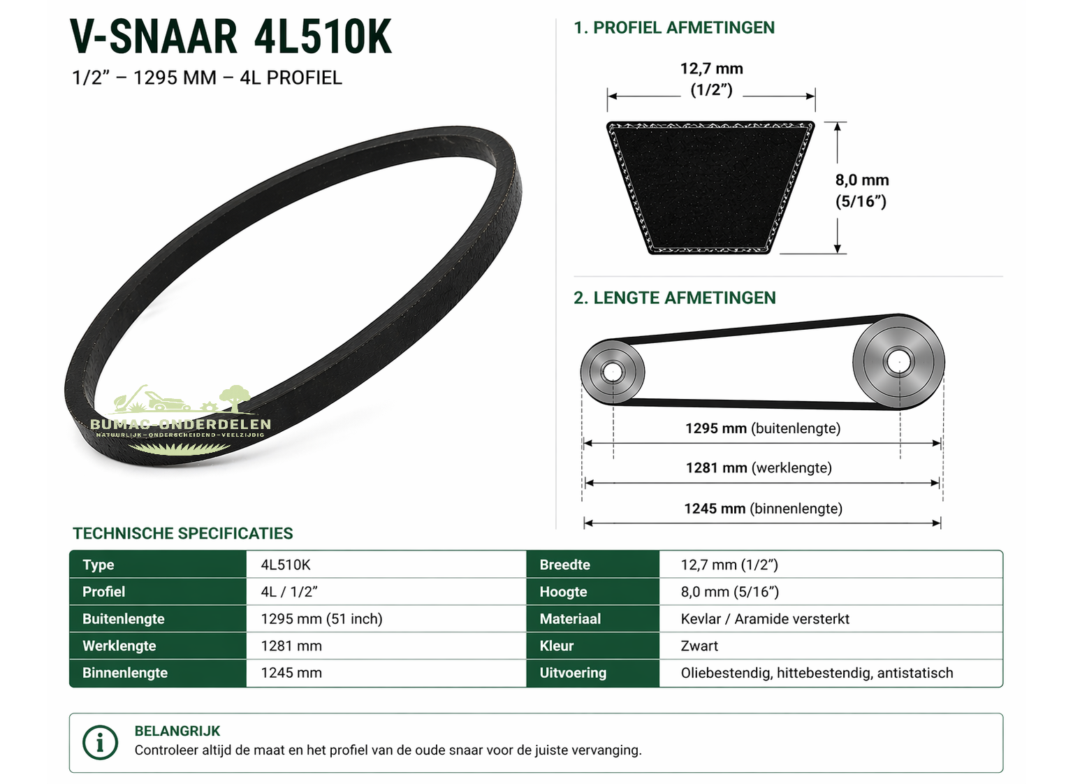 V-snaar 4L510K onderdeel 1/2 inch 12,7 mm – 1295 mm buitenlengte – Kevlar versterkt aandrijving onderdeel voor tuinmachines, hakselaars, versnipperaars en aandrijfsystemen