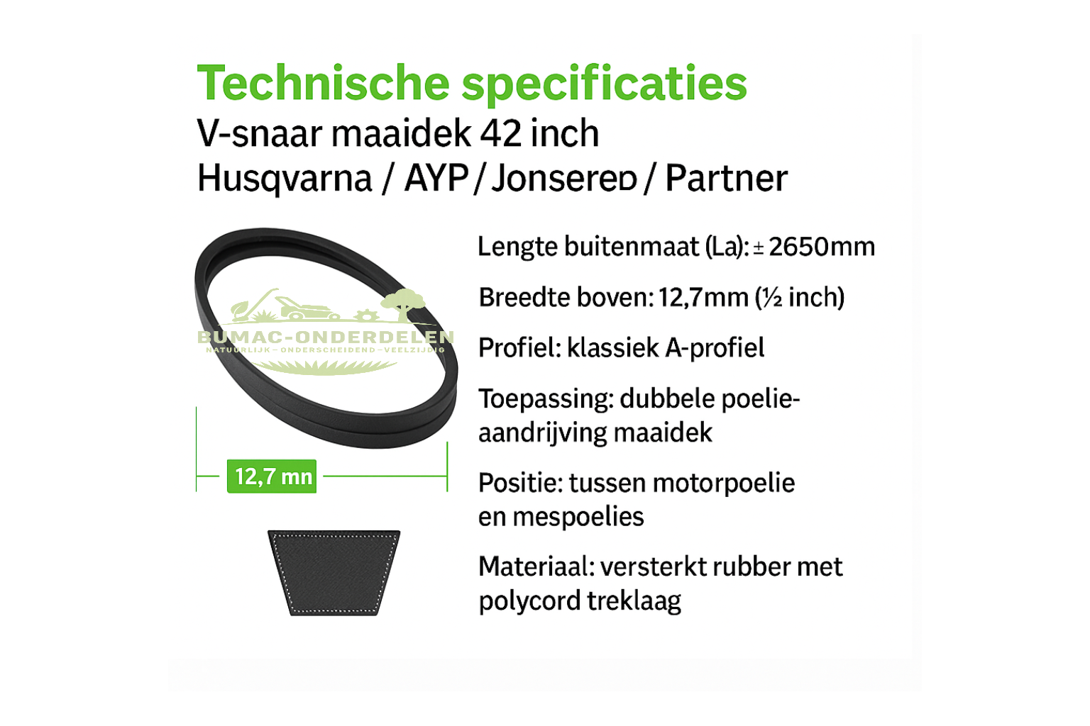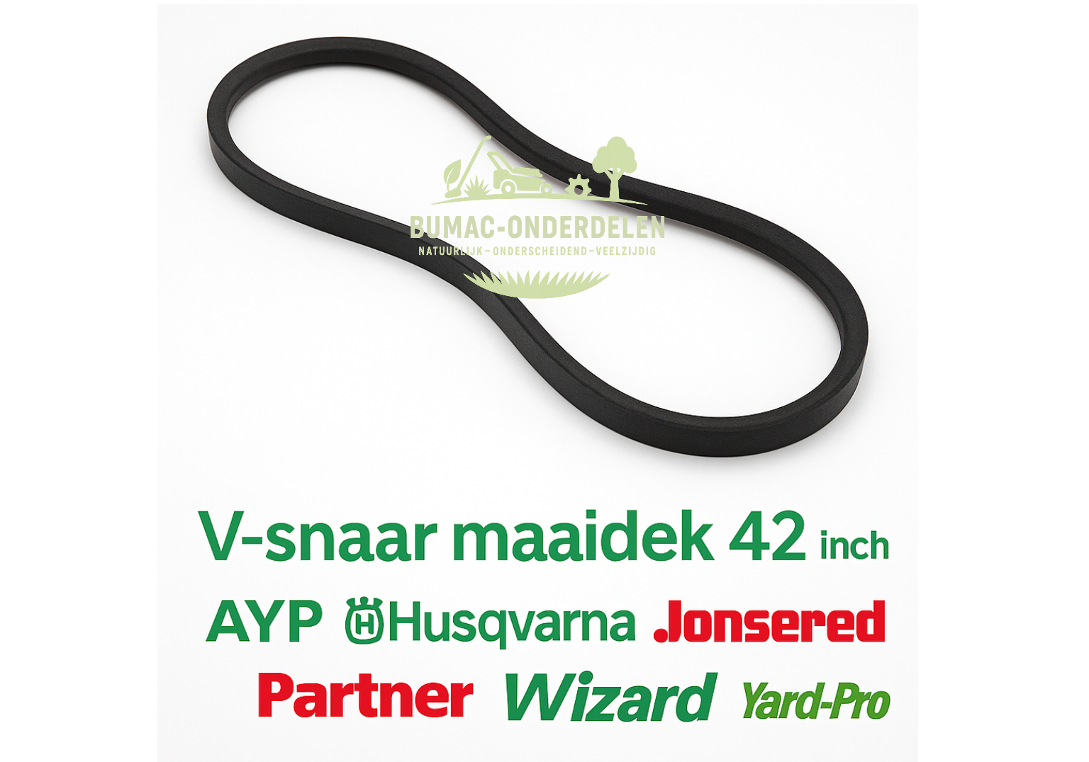 Deze versterkte V-snaar voor 42-inch maaidekken is geschikt voor Husqvarna, Jonsered, Partner, Wizard, AYP en Yard-Pro zitmaaiers.