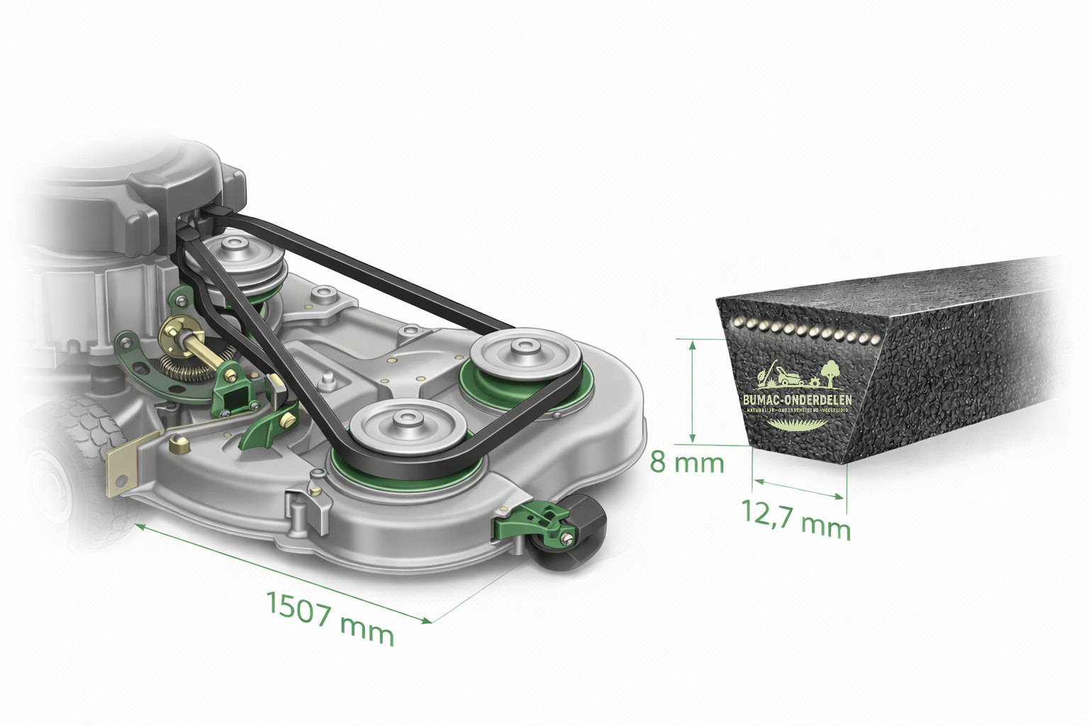 De aandrijving bij deze machines verloopt via één centrale V-snaar. Dit betekent dat de juiste maat, het juiste profiel en de juiste spanning direct invloed hebben op de prestaties van het maaidek. Bij slijtage of rek ontstaan direct problemen zoals slip, vermogensverlies of ongelijk maaien.