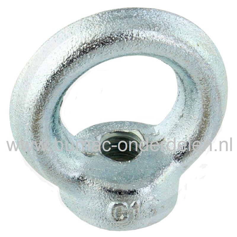 Verzinkte Oogmoer M10 Oogmoeren worden ook wel Ringmoeren, Oogbouten of Hijsogen genoemd. Door de ring is het erg geschikt voor het bevestigen van kabels De moer heeft een gesloten oog en wordt veelal gebruikt in combinatie met een draad, conform Din582
