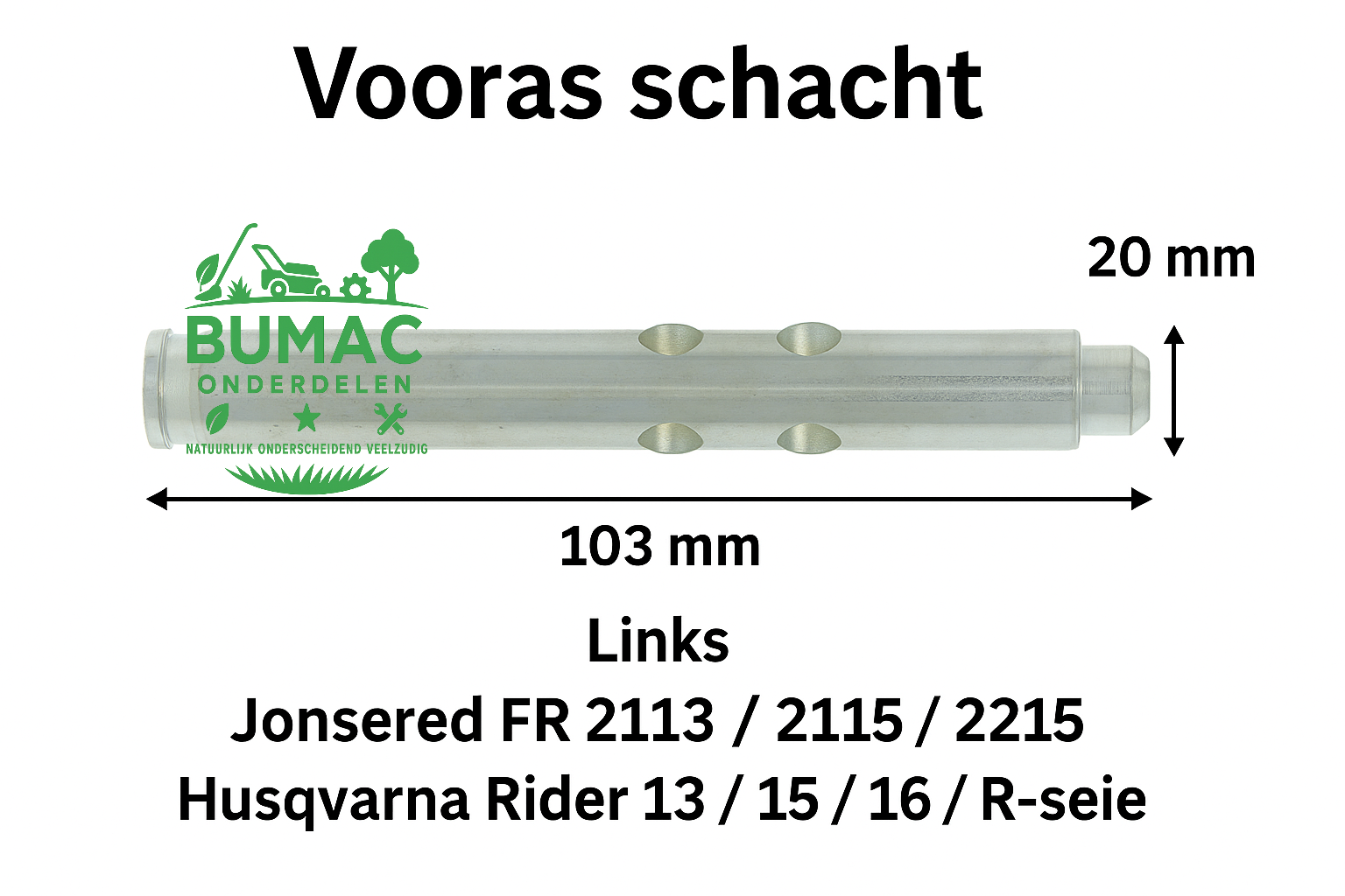 De as is vervaardigd uit slijtvast staal en heeft een lengte van 103 mm, met een standaard diameter van circa 20 mm. De pasvorm is origineel (OEM), wat zorgt voor snelle montage en optimale veiligheid van de wielophanging. Deze vooras schacht is dus de perfecte keuze voor onderhoud of vervanging van je frontmaaier. ✅