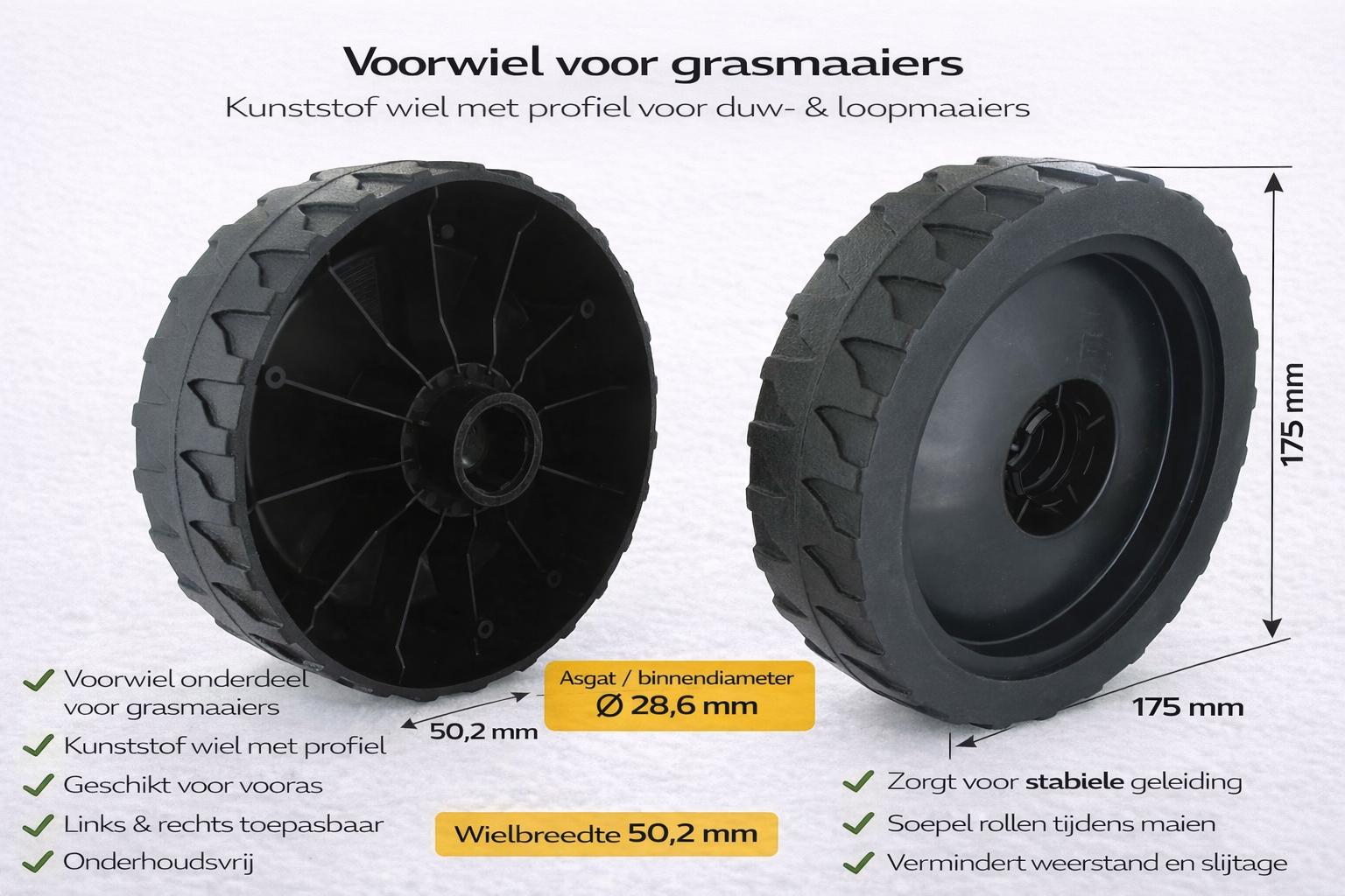 Het voorwiel onderdeel zorgt voor geleiding, stabiliteit en een soepele verplaatsing van de grasmaaier tijdens het maaien en manoeuvreren.
