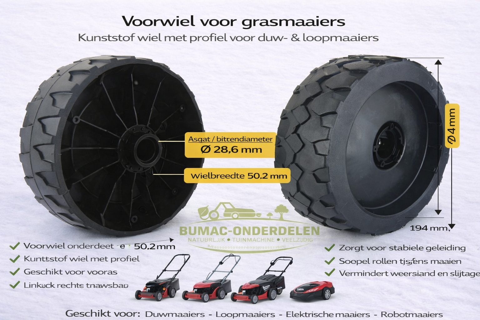Ook toepasbaar op andere duw- en loopmaaiers met overeenkomstige wielmaat en asdiameter.