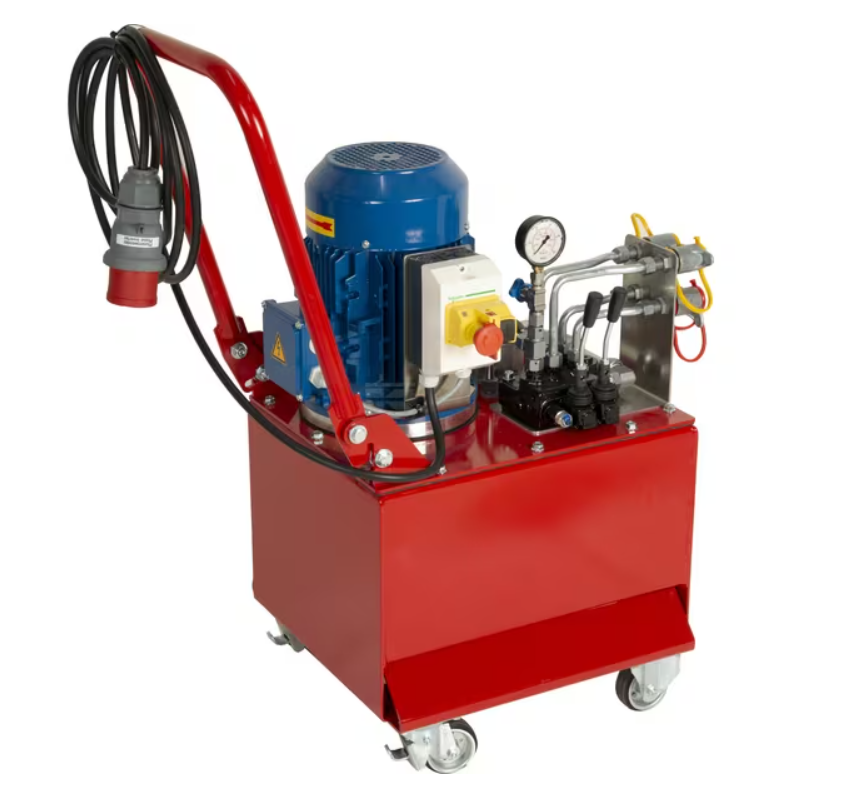 WP85B002 Werkplaatsaggregaat 35l-9l/min-4kW/400V – Hydraulisch systeem voor werkplaatsdoeleinden met wielen, manometer, retourfilter en elektromotor