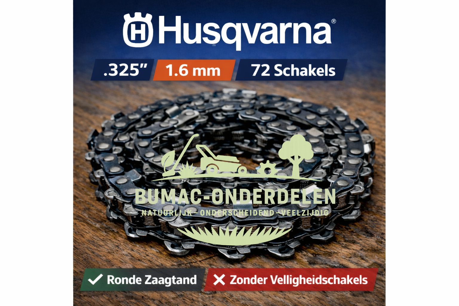 Dit zaagketting onderdeel voor Husqvarna heeft .325 steek, 1,6 mm groefbreedte en 72 schakels. De ronde zaagtand zorgt voor soepel, gecontroleerd zaagwerk. Altijd passen op maat, niet op gevoel.