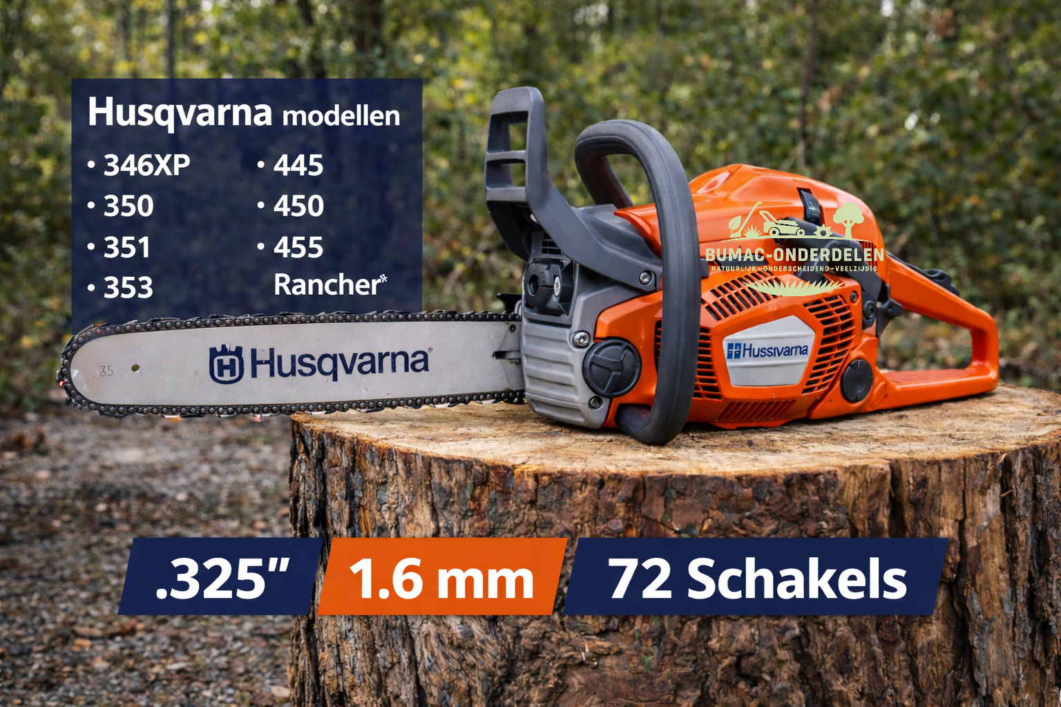 Deze zaagketting onderdeel is bedoeld voor Husqvarna kettingzagen die werken met .325 steek, 1,6 mm groefbreedte en 72 aandrijfschakels. Dit is een veelgebruikte maat binnen het Husqvarna-programma, toegepast op verschillende middenklasse en allround machines, afhankelijk van zwaard en uitvoering.