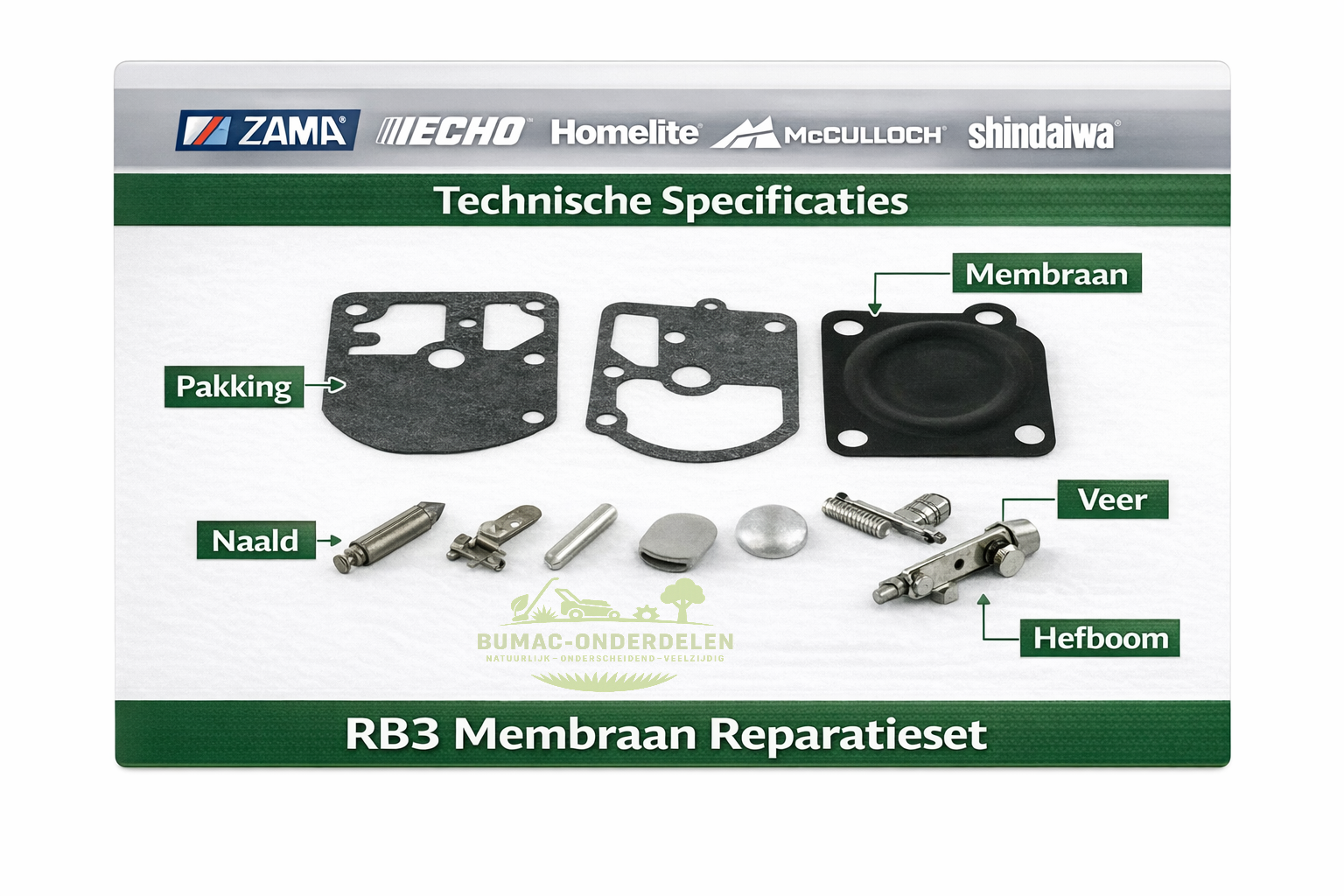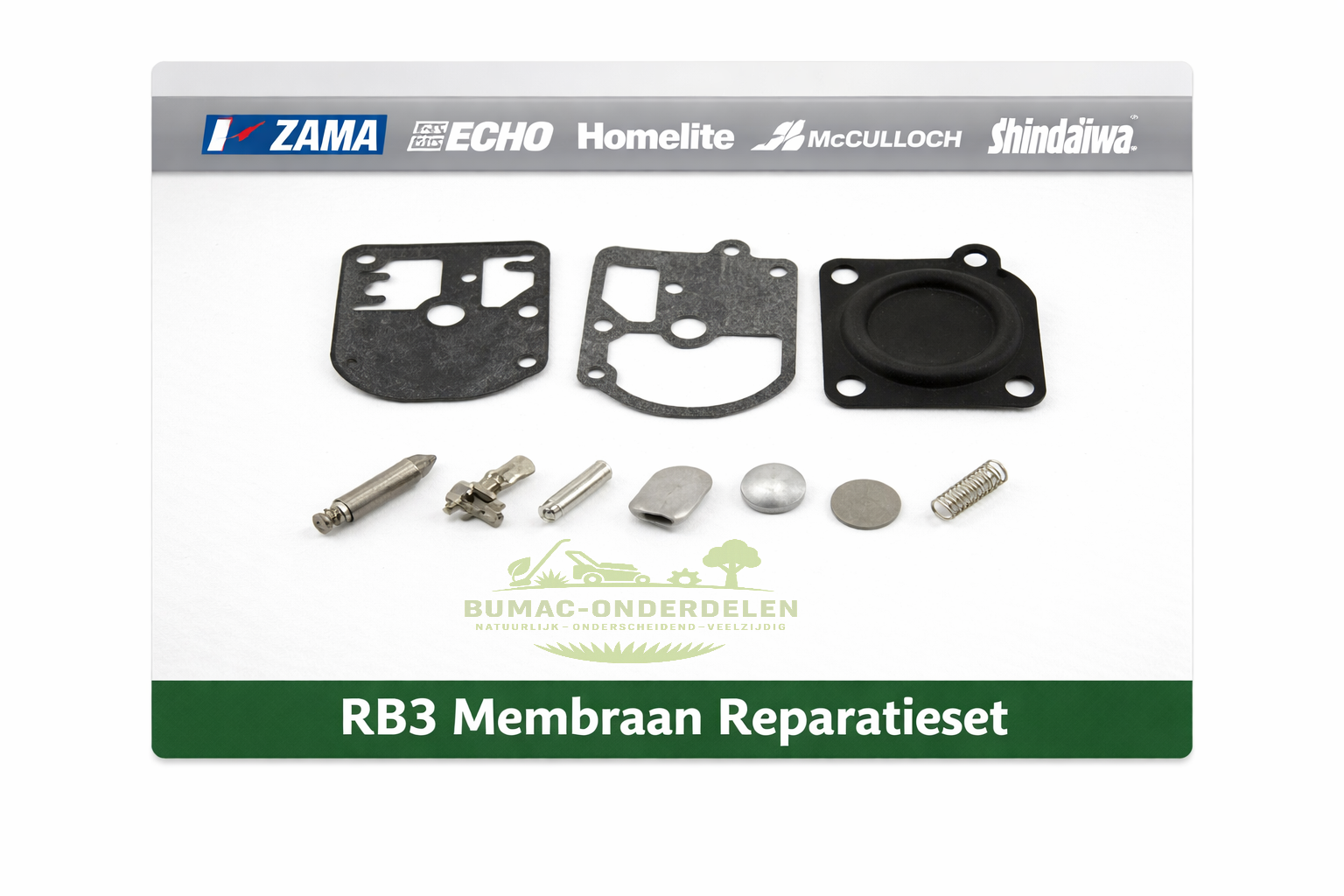 Zama RB3 membraan reparatieset onderdeel voor carburateur revisie. Geschikt voor C1S carburateurs en toegepast in kettingzagen, bosmaaiers en trimmers van onder andere Echo, Homelite en McCulloch.