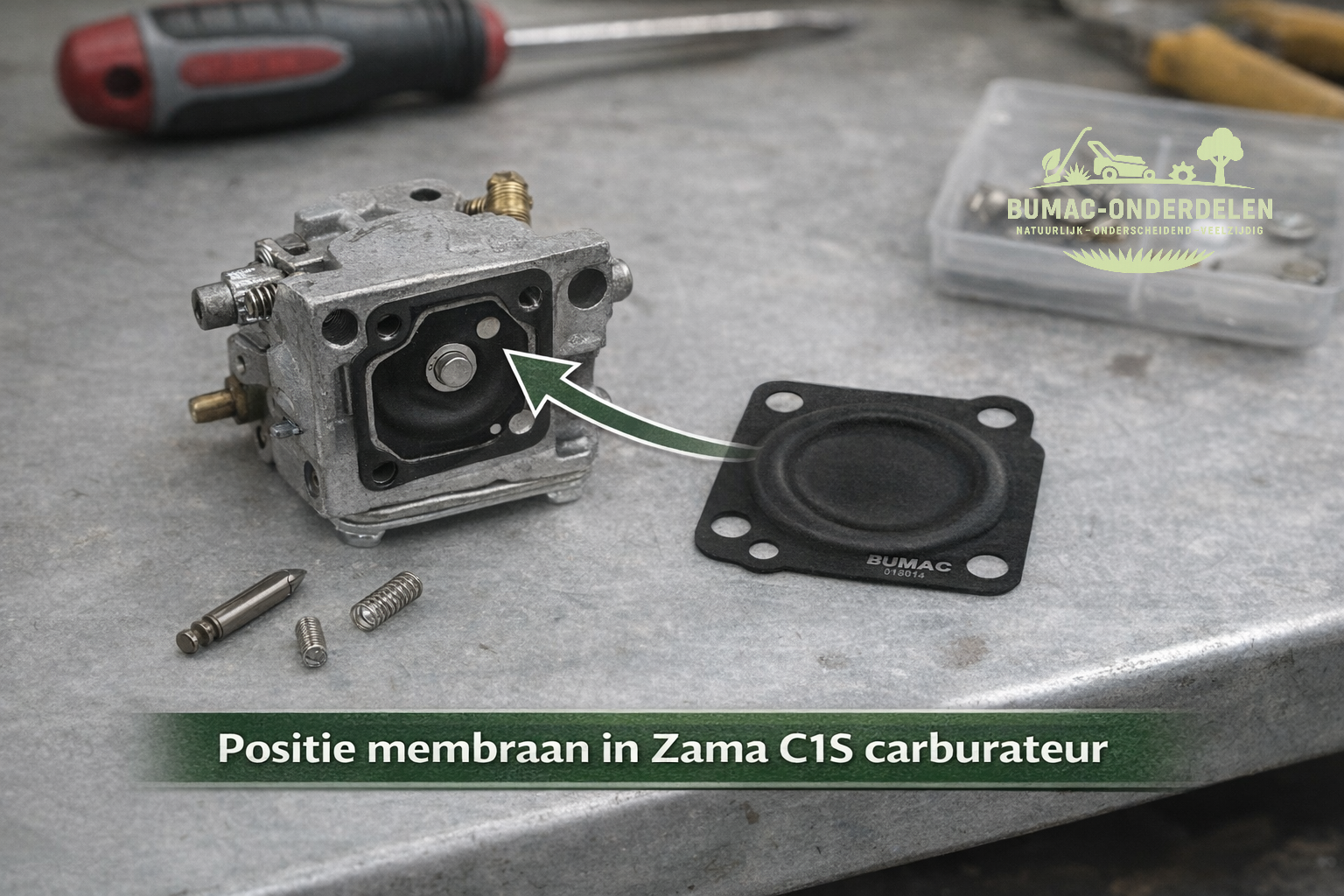 Let bij montage op de juiste volgorde van pakking en membraan. Bij Zama carburateurs verschilt de volgorde per zijde. Een verkeerde montage zorgt er vaak voor dat de motor niet start of alleen op choke blijft lopen.