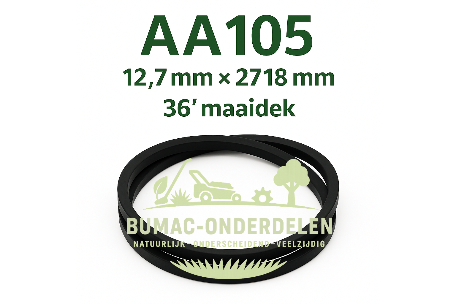 Deze AA105 zeskantsnaar is een betrouwbare universele budgetriem voor 36" maaidekken van Countax, Westwood, Husqvarna, AYP, Partner, Wizard, Castelgarden en aanverwante zitmaaiers. Met 12,7 mm breedte, 2667 mm binnenlengte en 2718 mm buitenlengte past deze riem op een groot aantal modellen met 36" IBS, XRD en HGM maaidekken.